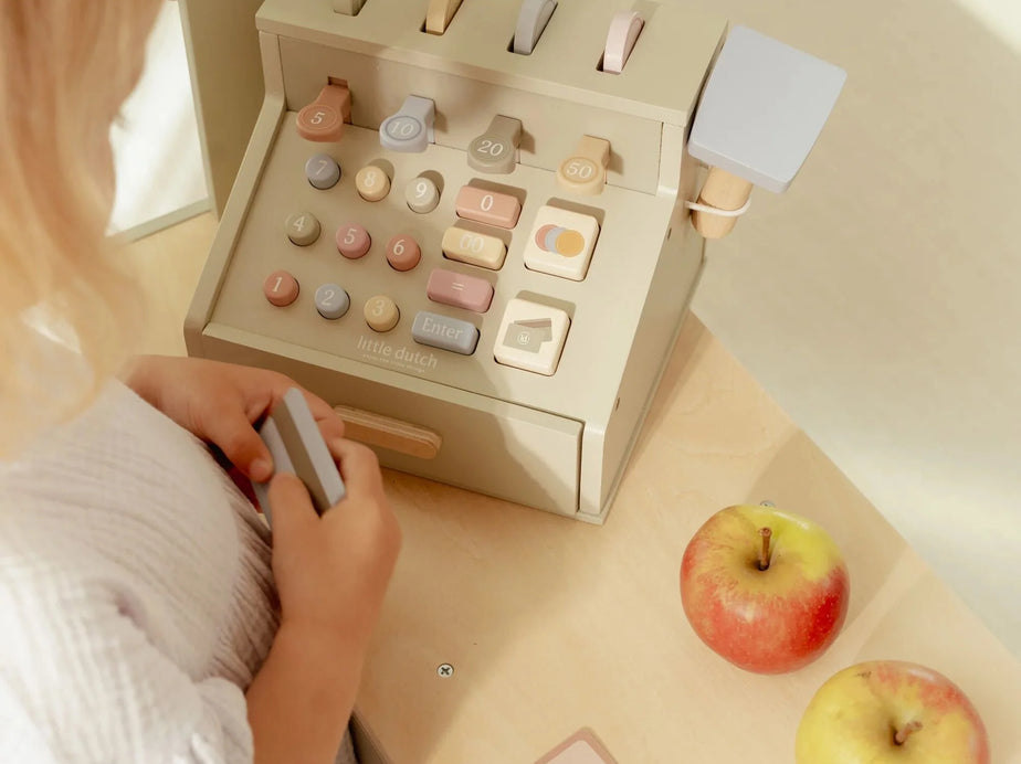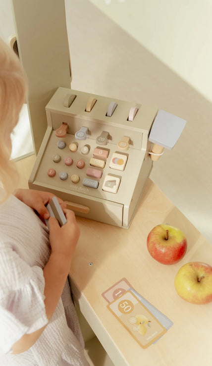 Un registratore di cassa in legno che stimola gioco simbolico, autonomia e immaginazione.